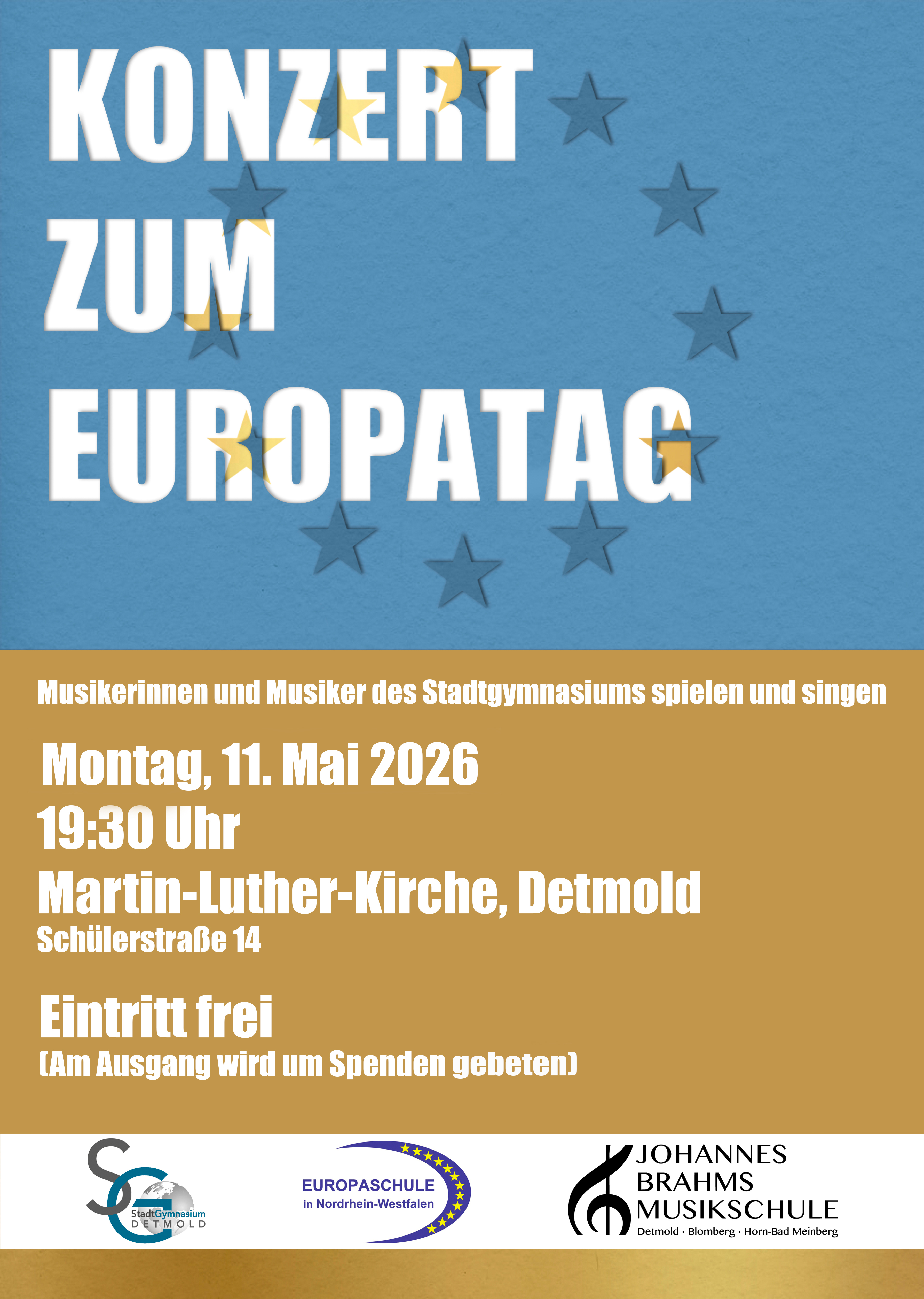 Seit dem Jahr 2016 trägt das Stadtgymnasium Detmold dank der erfolgreichen Zertifizierung durch das Land Nordrhein-Westfalen den Titel „Europaschule“. Damit werden die besonderen Leistungen der Schule in der Förderung fremdsprachlicher und interkultureller Kompetenzen gewürdigt. Der Zielsetzung, das kulturell Verbindende hervorzuheben, widmet sich die „Musik zum Europatag“ am Montag, d. 11. Mai 2026 um 19:30 Uhr in der Martin-Luther-Kirche. Alle beteiligten Künstler freuen sich darauf, dem Publikum auch in diesem Jahr ein abwechslungsreiches Konzert zu Gehör bringen zu dürfen: Auf dem Programm stehen dabei Kompositionen von der Renaissance bis zur Moderne, dargeboten von Schülerinnen und Schülern sowie Menschen aus dem Umfeld der Europaschule Stadtgymnasium Detmold.